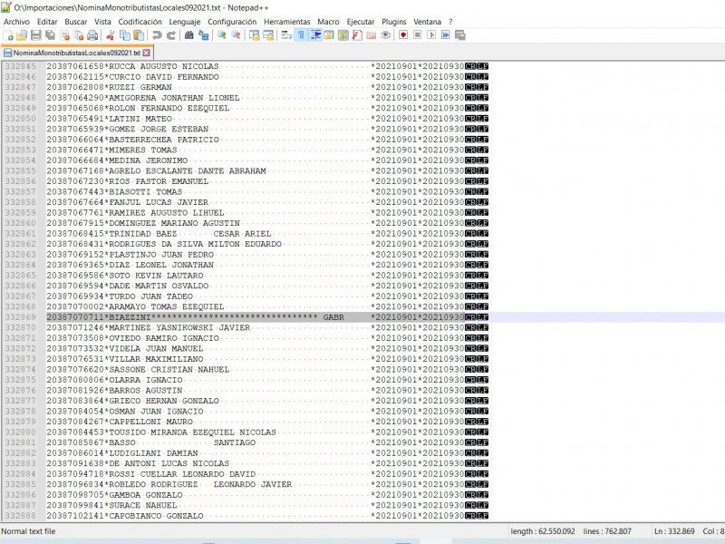 El archivo generado por ARBA, posee en el renglón (registro) 332869, el nombre del contribuyente mal formateado.